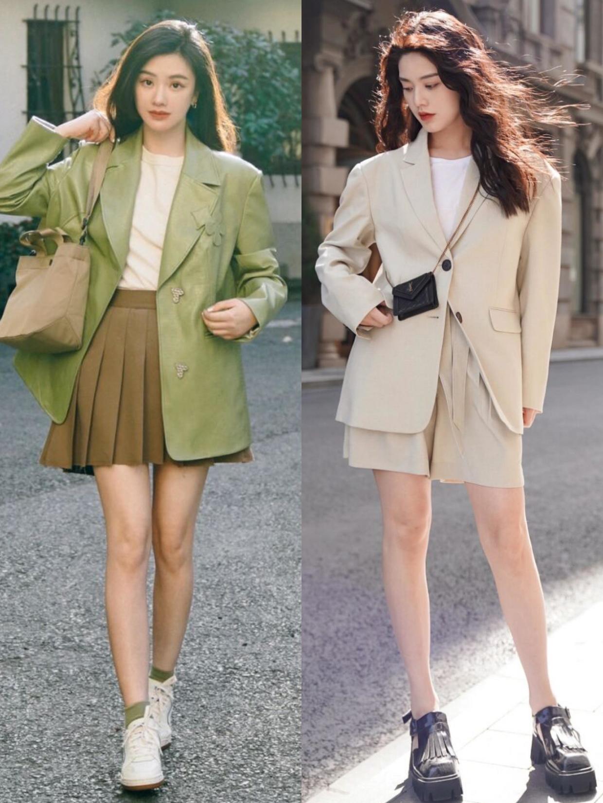 西装并不一定必须得是正统庄重的单品,它也可以成为大家用来凹造型的神器,现在刚好到了升温的季节,如果怕热,就搭配裙装/短裤来秀出自己的好身材吧,到大腿的长度刚刚好,能露出纤长白皙的双腿,还会带来非常清凉的感受,特别适合腿细的姐妹。