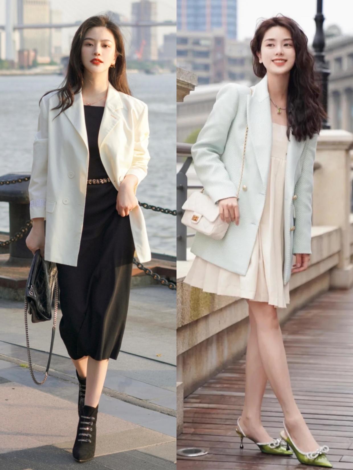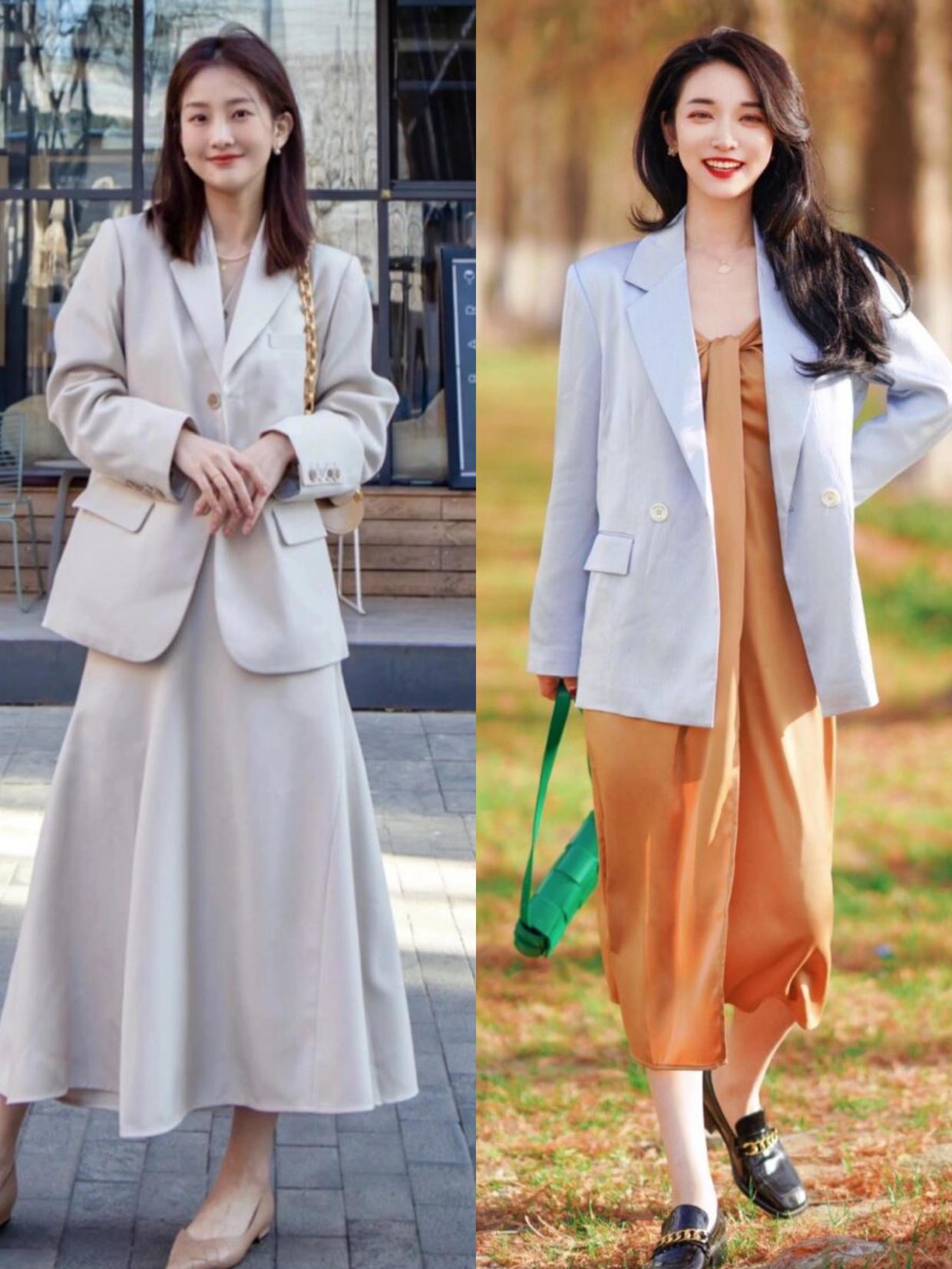 如果不想穿的太过花哨,就借鉴“基础色搭配法则”吧,白色西装+黑色连衣裙的组合是最经典的,也是最符合职场OL需求的,两个颜色都是基础色,结合后会形成色彩上的碰撞,特别知性优雅、有女人味。淡蓝色的西装看起来很清爽,会让人联想到温柔的天空、清澈的湖水,颇有心旷神怡的感觉,搭配白色后就会将这一风格进行强化,怎么看都很清爽。