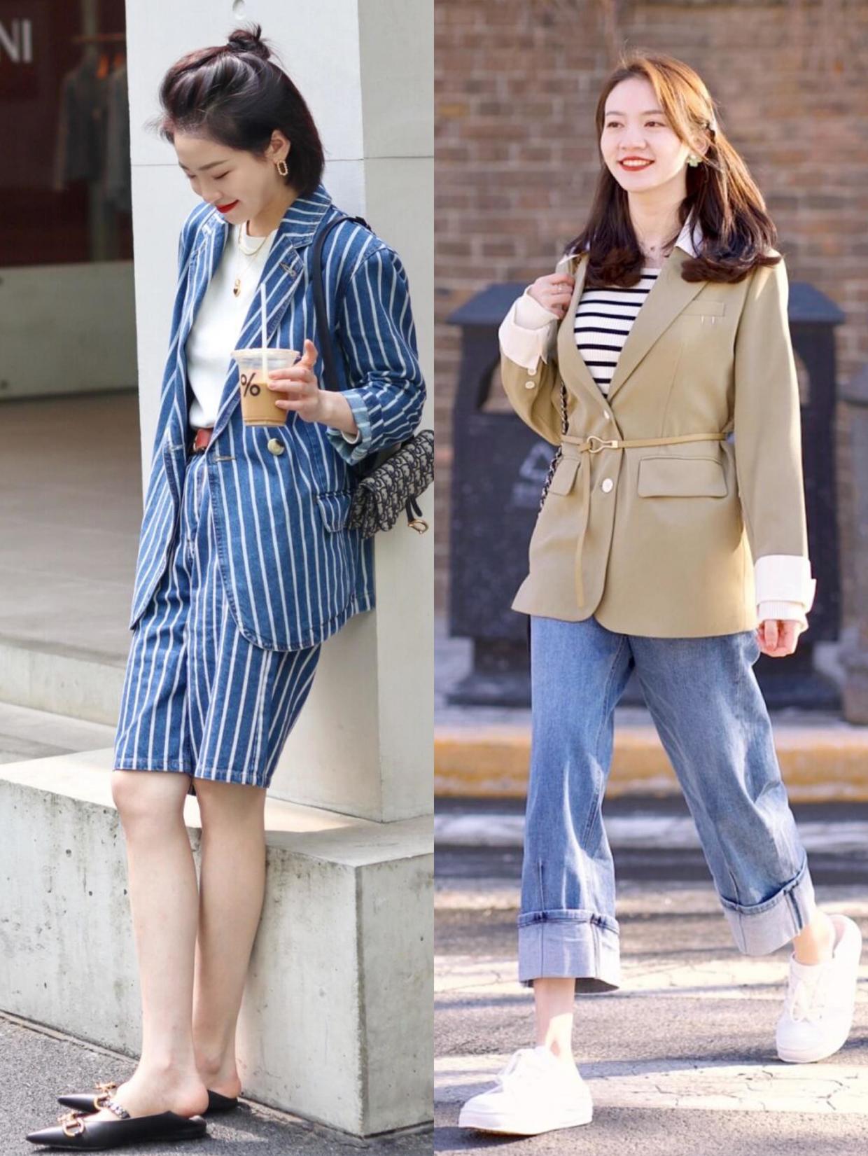 最后为你介绍的是休闲风比较足的西装搭配,融入了竖条纹印花的蓝白色西装套装显白又大气,不仅对穿搭者没有过高的要求,还会通过宽松短裤带来舒适又清爽的体验。如果你想试试混搭风,也可以选择西装+牛仔裤的搭配组合,是百穿不腻的,适用场景十分广泛。