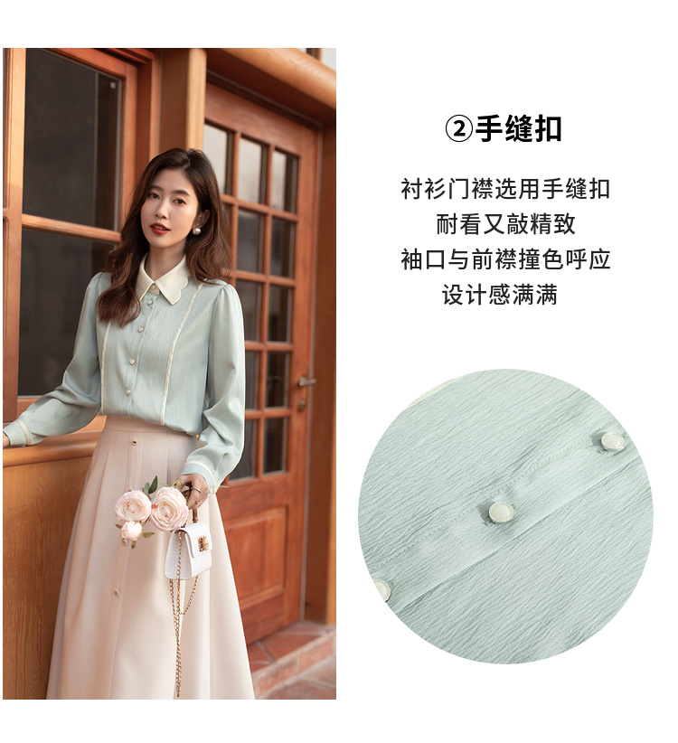 绿色花瓣领的衬衫很符合现在的季节,穿搭起来特别地清爽,不管是穿搭去上班、逛街、旅游、约会都是不错的选择之一。