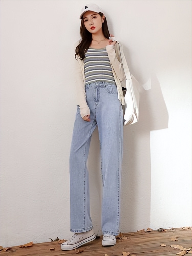 那么为了修饰腿型,可以选择直筒牛仔裤或是阔腿牛仔裤,得益于牛仔裤硬朗的版型和利落的线条,可以很轻松的纠正腿型,优化腿部的比例,让腿部更显笔直修长。