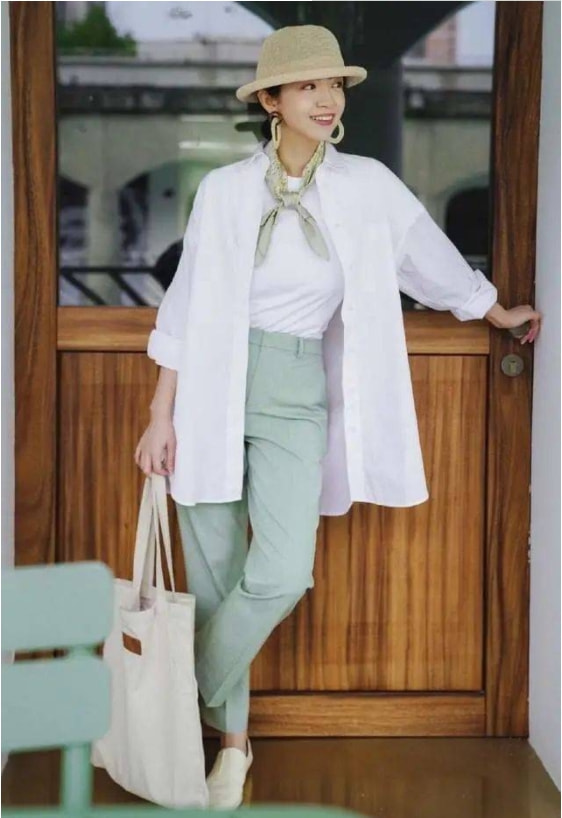 绿色的小西裤,外搭白色的宽松衬衫,浅绿色丝巾与小西裤的同色系呼应,显得清新时髦又很有层次感,上身效果清爽又减龄。如果想要显高显瘦,那就选择九分裤款式,能够更好展示脚踝的细长部分,这样穿出来的造型更加地时尚和洋气。