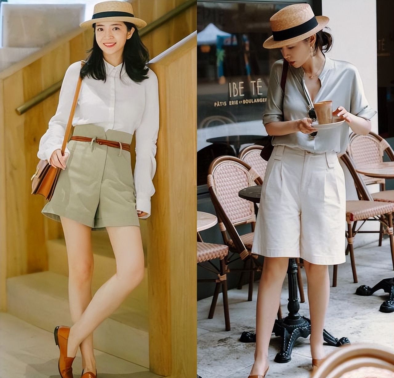 上绿下白的搭配,比较日常、和谐不冲突,适合小个子的穿搭。绿色衬衫建议选择低饱和度的颜色,亮度低,看起来更沉稳大气、干净清爽,适合小清新风格的女生。短裤配衬衫是一种不错的搭配,淡绿色的衬衫,绸缎般质感,自带高级感,很容易打造气质感穿搭。下半身搭配白色牛仔短裤,清爽又时尚,整体搭配就显得随意时尚了一点。同时将衬衫扎到裤腰里打造出高腰线,立马拥有大长腿哦。