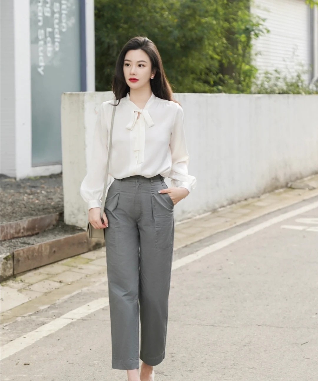 这组穿搭采纳的灰色长裤,属于可以创造多种风格的单品。和上面两款白色裤装一致的是,它的裤型带有明显的空间感,可以容纳许多腿型方面的不足,还可以配合白色飘带衬衫,展现知性韵味。
