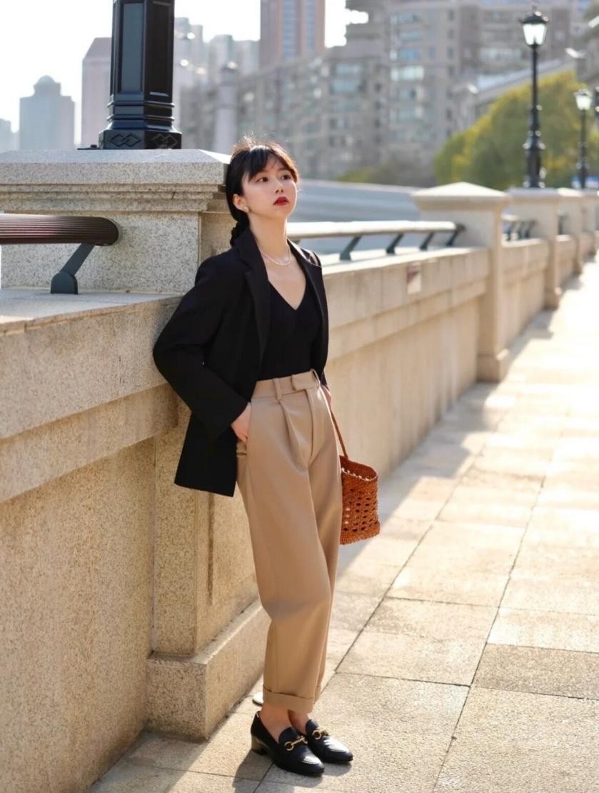 一条卡其裤烟管裤配上黑色乐福鞋,将裤腿稍微挽上去露出纤细的脚踝会更加显高,用黑色的西装和内搭来与卡其裤相映成趣,增加成熟干练之美,整体随性自在非常有分寸。注意:黑色内搭的露肤作用,它能最大限度地释放女性魅力。一条“卡其裤”就能和同龄人拉开差距,中年女人就该这么穿。