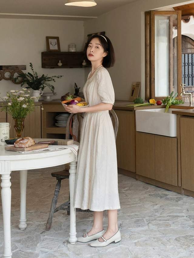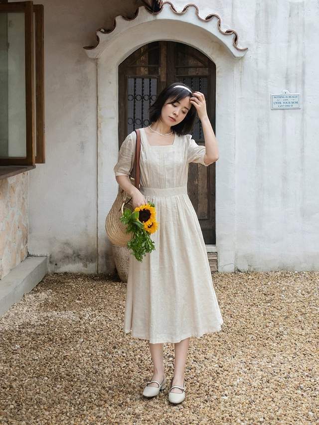 想要穿出高级感,除了要选对连衣裙的款式之外,还要注重穿搭细节,这位时尚博主不仅选择了精致的项链来点缀,还选择了浅色鞋子来搭配,复古又有气质。