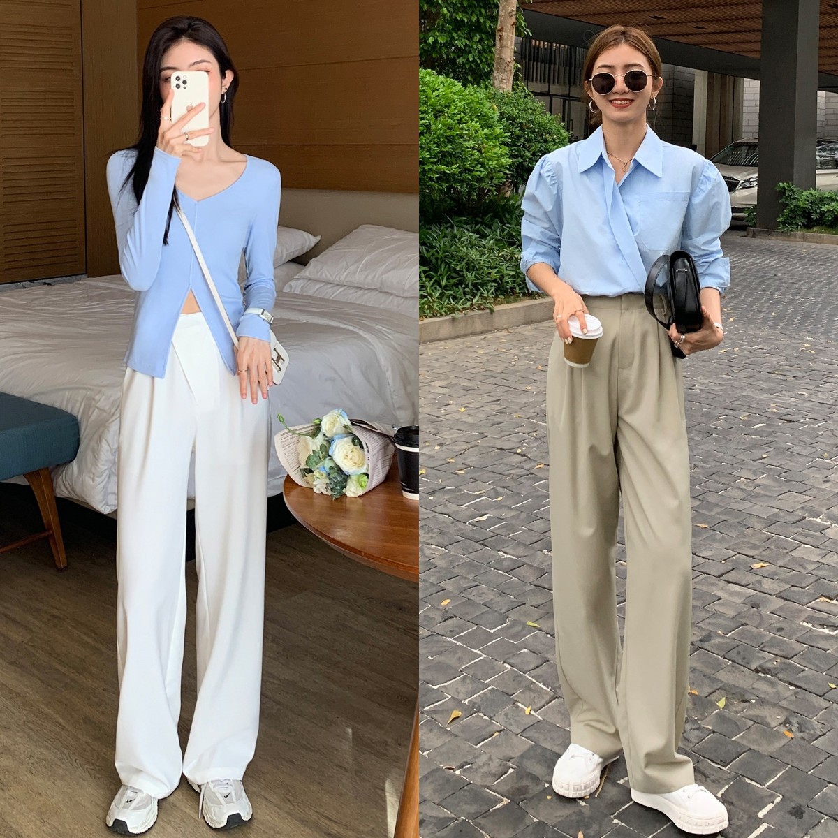 如果喜欢比较知性一些的穿法,就可以借鉴下图中的蓝色系上衣搭配白色阔腿裤、中性色阔腿裤的穿法。