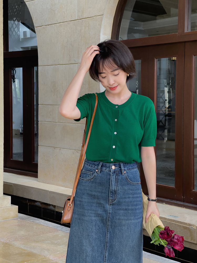 LOOK3:圆领绿色针织开衫+牛仔半身裙。