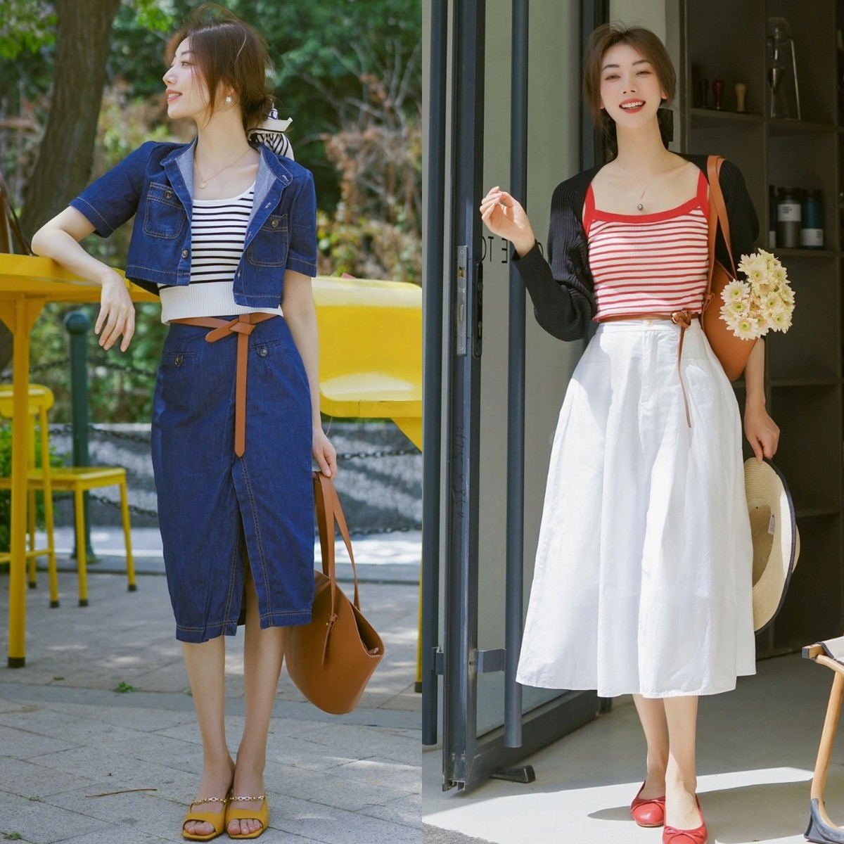 要想演绎出法式风格的穿搭,还可以入手带有条纹元素、波点元素的上衣与纯色半身裙搭配。条纹元素与波点元素在时尚圈中都属于经久不衰的时尚元素,带有复古感与浪漫气息。