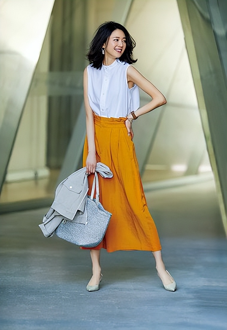 炎热的夏季,如果只是尝试基础的风格,你的搭配就很难出彩,可以尝试有对比性的穿搭,例如选择白色的上衣,搭配黄色的半身裙,两种色彩跳跃性很强,但是从视觉上来看,能够让风格变得更加年轻显气质。