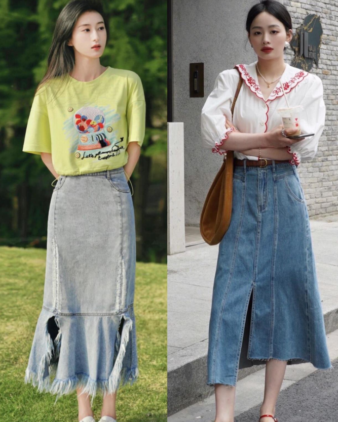 半身裙大多数是比较长的,几乎都到小腿部分。所以如果它是做的低腰线,就会把视觉效果拉倒膝盖以下的部分,不仅展现不出半身裙的飘逸和灵动,反而会让你呈现出一种头重脚轻的视觉效果。而且高腰线的半身裙,会让我们的下半身看起来更加长,整个比例会更加好。