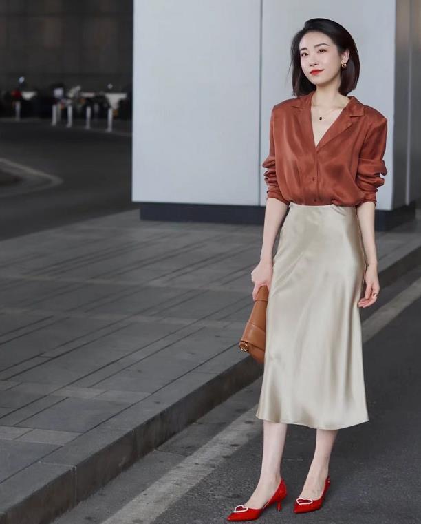 想要将真丝衬衫穿得更显优雅女人味一些,大可以选择半身长裙来配,它们的组合真的是完美极了~