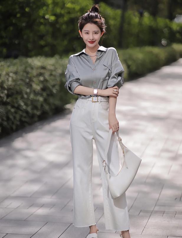 衬衫的下摆要塞进裤子或裙子里,或者是利用起腰带进行点缀,提高腰线,从而拉长下身比例,这样穿真丝衬衫看起来会更加得体大方。