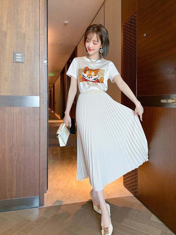 而卡通印花T恤+白色百褶裙,乖巧可爱的短袖T恤,显得十分可爱,深受小女生们的喜欢。下面搭配一条简约的白色百褶裙,层叠的百褶元素点缀,穿搭起来极具浪漫气息。当然,脚上的金属感平底鞋搭配,也毫无违和感,给人的感觉优雅自然还减龄。