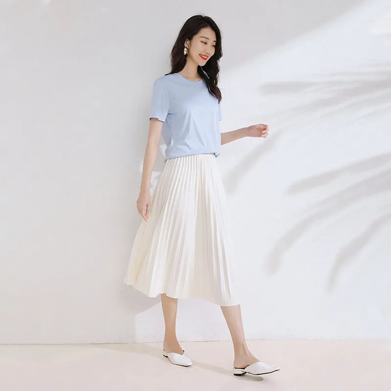 比如,白色百褶裙+短袖T恤,浅蓝色的短袖T恤,短款宽松显瘦的版型设计,穿搭起来更加清凉舒爽。而下面搭配了一条白色高腰百褶裙穿搭,高腰显瘦的裙型,穿搭的显瘦更显高挑。并且白色相比其它颜色视觉上更为淡雅,柔和又耐看,还自带仙气儿。