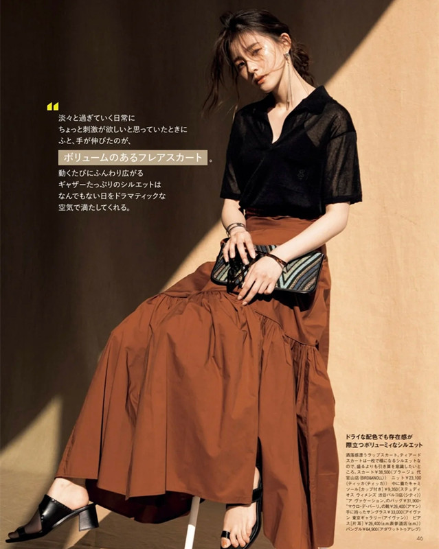 因此,在T恤+长半裙搭配时,可以通过缩短上身、拉长下身的方式,塑造出好比例、大长腿的既视感。缩短上身比例,只需要将T恤的衣角塞进裤腰里面即可,简单的一个小动作,却是让造型高级的关键。