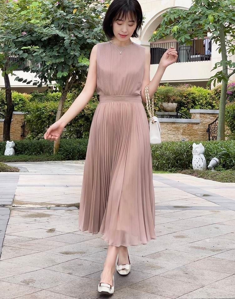 像是这套单品,也是宽松舒适的版型,但是色彩上是雾粉色,看起来高级又少女,根本不用担心压个子的问题。再有就是我们可以加入褶皱的设计,褶皱是非常显瘦的,加入在宽松的单品中能迅速让单品看上去有层次感,也就不会那么单调。像图中的多层压褶,让本来普通的裙装变得时髦又浪漫。
