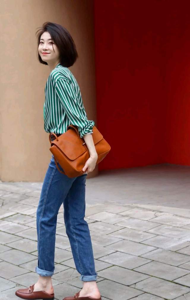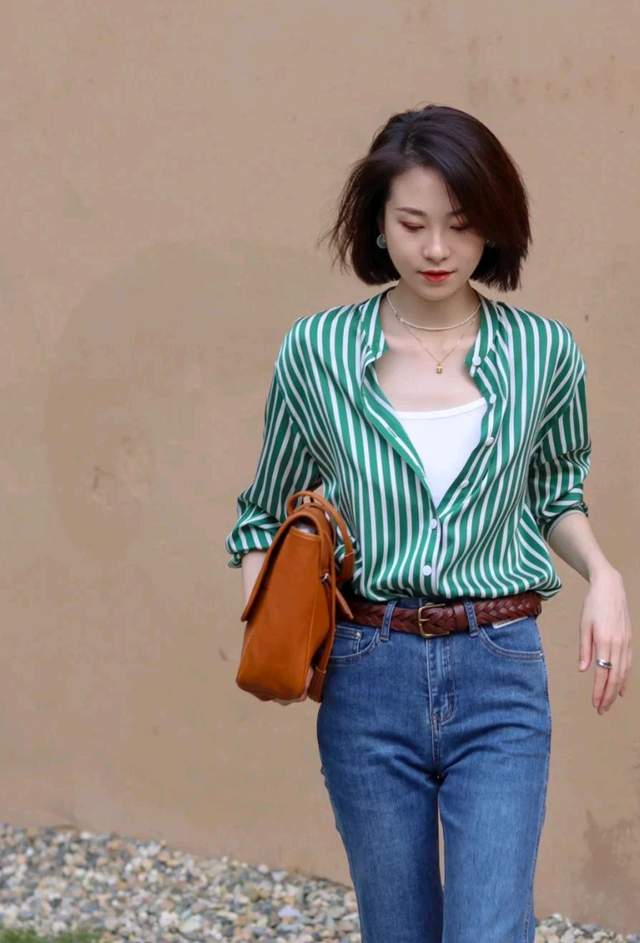 夏天女生衬衫怎么穿才好看?绿色条纹衬衫+蓝色牛仔裤 高级感十足(3)