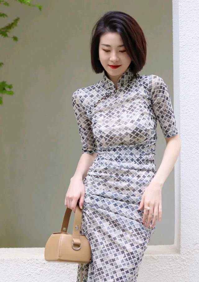 首先,旗袍采用了格纹设计,看上去又显得很经典,不会显得太过夸张,也不会觉得太过低调。