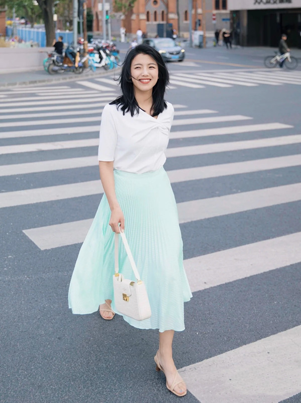 白T+百褶长裙,穿搭简单又简约。在将经典与经典组合时,版型是否协调平衡很关键。若是上下装的版型一致,容易出现紧绷或松垮的情况,不够时髦大气还容易暴露身材缺点。建议秉持着松紧对比的搭配要点,让白T>百褶裙,形成“上紧下松”的既视感,在松紧之间找寻平衡,遮肉显瘦。