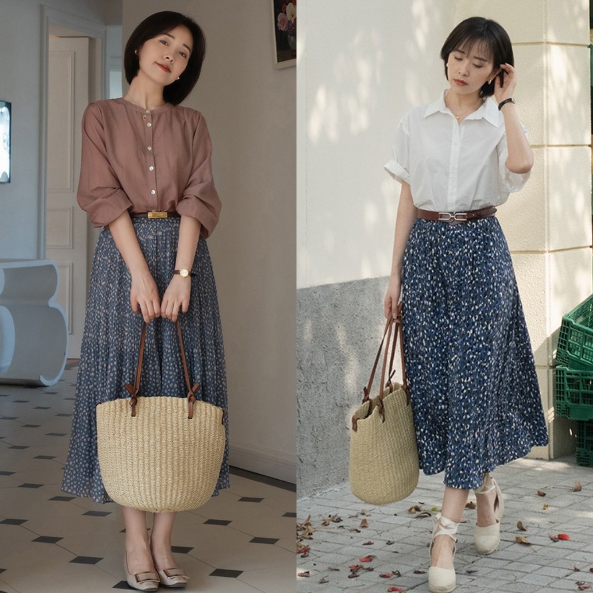 要想打造出知性感满满的造型,我们还可以选择衬衣和半身裙的搭配。不仅能增添干练元素的气息,还能让你的造型更加高级有气质。但要注意,尽量选择轻薄透气一些的衬衣款式,像是下图(左图)中的这种真丝衬衣,就是很不错的选择,既能满足透气感的需求,又能打造出知性通勤的效果。