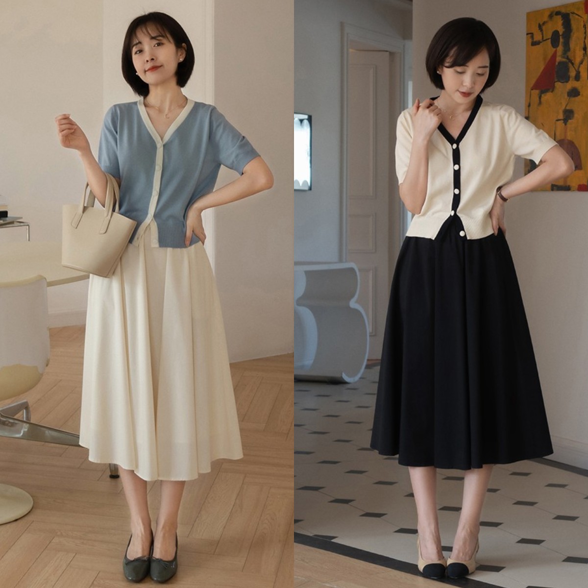 但要想让你的搭配风格看起来更加温柔,还可以选择开衫和半身裙的搭配。但要注意尽量选择款式轻薄一些的小开衫,像是下图中的这种选用了v领以及短袖设计的针织开衫就是很不错的选择。搭配高腰半身裙,既能满足透气感的需求,又能增添温柔的气质。