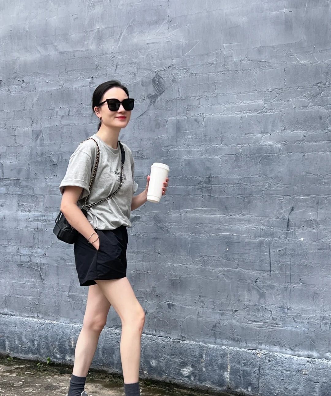 像这款浅灰色的T恤,它搭配的是黑色的短裤,裤装没有对腿部的过多的覆盖,就能释放出最随性的感觉,打造出最舒适、最凉爽的穿搭,这种搭配相当率性。