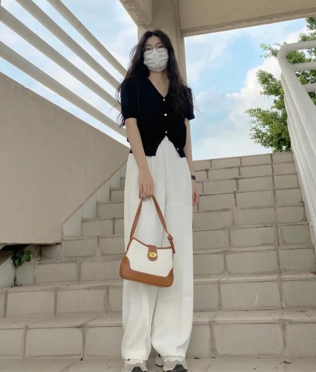 上短下长的搭配原则,相信没有谁会不认识的吧?黑色短袖针织衫,这种冰丝材质的面料,很适合在夏季里穿,完全不会因为它是黑色而让人感觉到闷热。当然,视觉上会有些许的沉闷单调,不过好在下装搭配的是白色直筒长裤子,干净的白色,正好能缓解黑色带来的压抑气息。