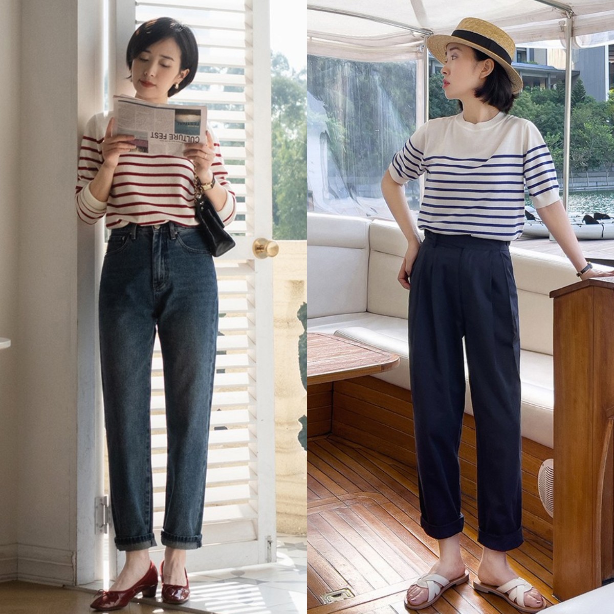 像是带有复古气息的“条纹T恤”就是很不错的选择,条纹T恤舒适又简单,实穿性满分。搭配牛仔裤可以营造出清爽干净的感觉,但要注意,选择带有高腰线设定的牛仔裤,可以在视觉效果上起到拉长双腿的作用,轻松get法式浪漫穿搭。