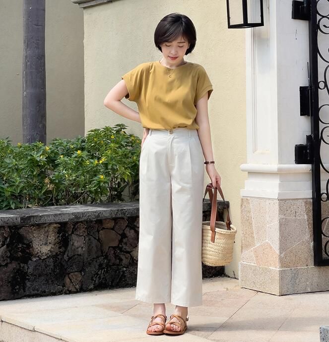 不要认为黄色会显老土味,实际上只要选择合适的款式和面料,照样高级又时髦!全棉面料的姜黄色圆领T恤舒适顺滑,搭配一条白色阔腿裤,知性又优雅。