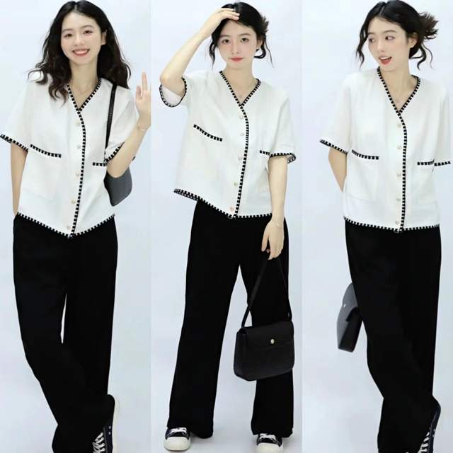 采用最简约的黑白配色方式,穿一件短袖款的白色小香风上衣,搭配上黑色西裤。清爽大气又不失优雅感,非常显气质。简单地搭一双黑色帆布鞋和一个黑色包包,就非常好看。