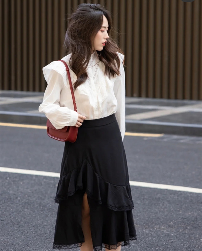 深浅结合的配色方案,也是常用的搭配思路。白衬衫+黑色A字裙,黑与白交融互错,用白色化解黑色的沉闷冷硬、用黑色调剂白色的单调无趣,从而尽显30+女性的高级审美和搭配水准,在黑与白之间将高雅贵气娓娓道来。并且,黑色A字半身裙的黑色与A字版型都恰好削弱下半身的量感,显瘦显苗条又不臃肿哦~