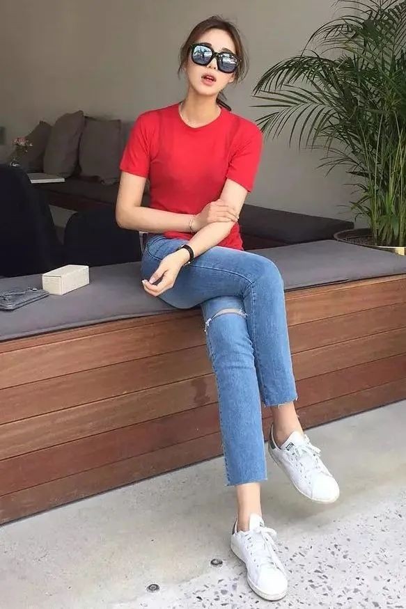 假如你的皮肤很白,那么可以考虑用下面这种时尚的红色T恤,这种亮丽的色彩穿在身上绝对能够让你从人群中脱颖而出,看上去非常的靓丽时尚,红色T恤搭配上高腰的牛仔裤,低调中又不乏时尚感,并且能够营造出高级感和干练的气质。