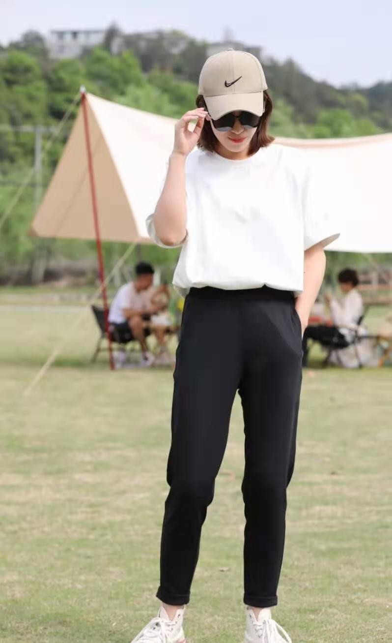 搭配建议:小黑裤的不足之处是色彩暗沉,夏天穿,容易穿出闷热感,所以,我们搭配小黑裤,必须搭配白色T恤、粉色衬衫、牛仔外套、蓝色针织短袖这样的亮色上衣,借助上衣的明亮度,弥补小黑裤不足。