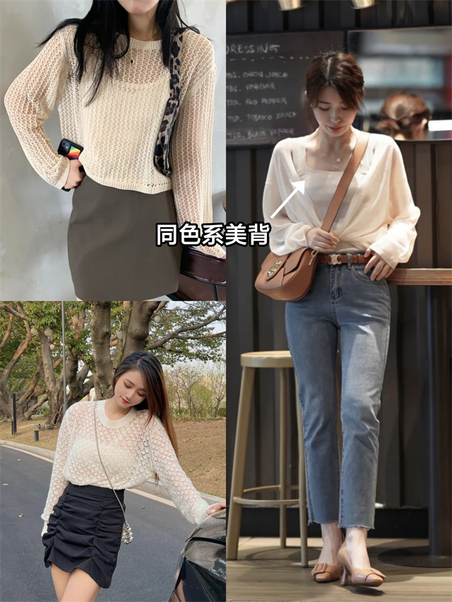 右边这位小姐姐就直接用半透明防晒开衫搭配纯欲风蕾丝美背,隐隐约约露出美背的肩带,搭配简单的牛仔裤,不就很美?