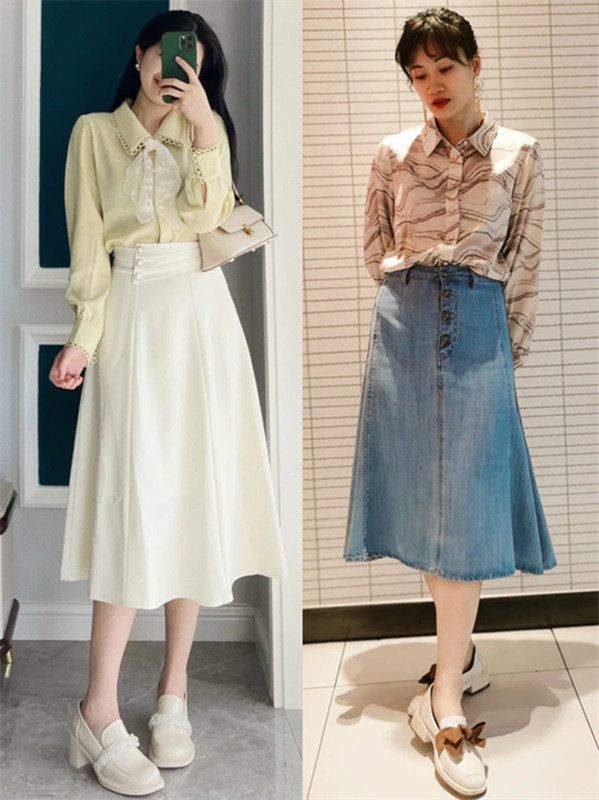 带有蝴蝶结和蕾丝边角的衬衫+高腰半身裙+英伦风乐福鞋、印花衬衫+A字半身裙+蝴蝶结乐福鞋,都是选择了带有装饰和花色点缀的上衣款式,使得它刚好和半身裙、乐福鞋形成视觉对比、款式平衡,让整体造型处在和谐的平衡值。看似简单的1个操作,却完美中和了乐福鞋多余的简约感,让造型多了柔情与浪漫气息,也展现出优雅女人的成熟与知性。