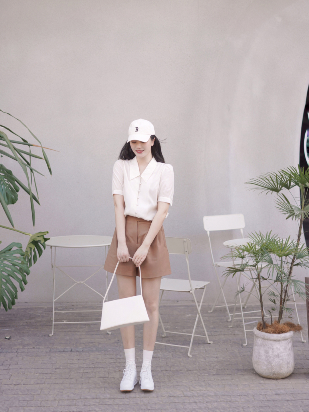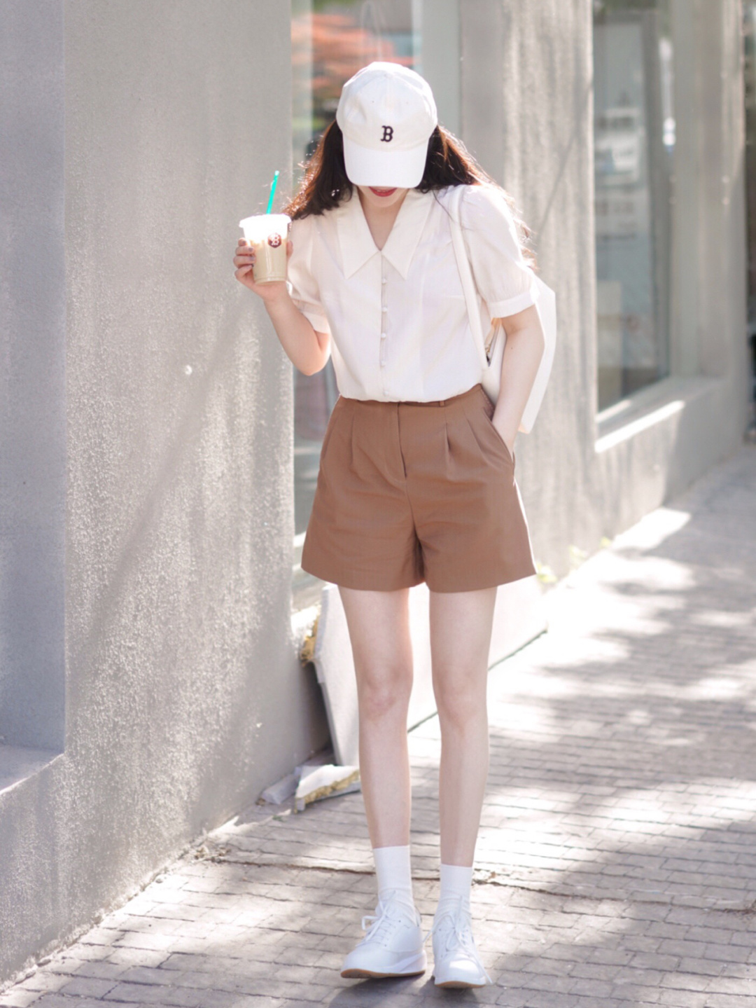 夏天女生穿白衬衫搭配什么下装?泡泡袖白色衬衫+卡其色短裤 特气质!(3)