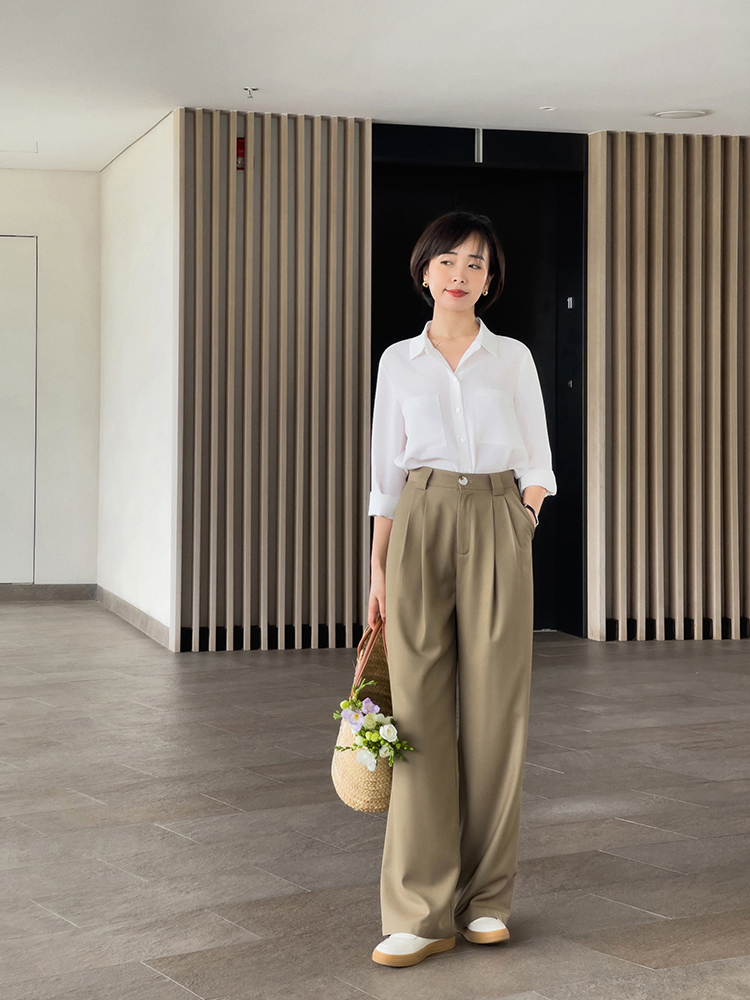 我们来看比较经典款的白色衬衫,不过建议选择长袖的更好搭配,同时也比较防晒,结合上春夏简约高腰直筒西裤,是不是很干练大气,这样的 职业通勤ol阔腿拖地裤,搭配上白色衬衫,穿去上班再适合不过了。