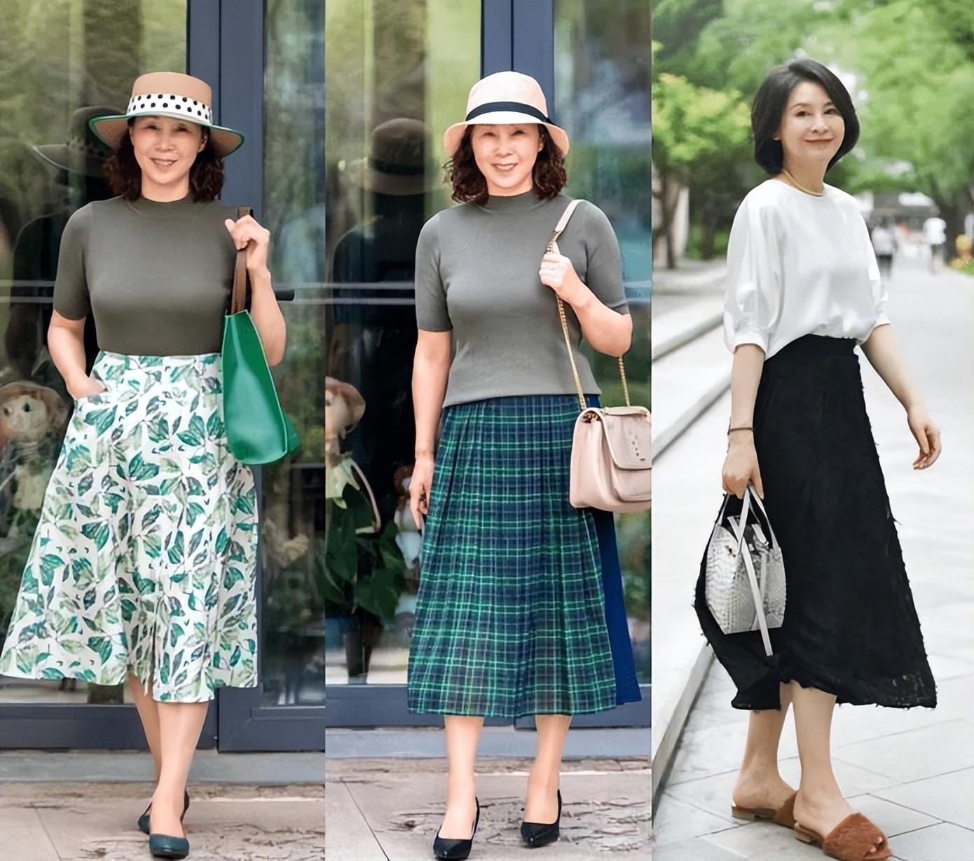 夏天想要将裙子穿得轻盈、时尚有美感,建议遵循“上短下长”的穿衣原则。利用修身的短上衣搭配宽松的半身裙,能更好地修饰我们的身材。再融入一点格纹、条纹这样的时尚元素,这样的穿搭会让你看起来年轻许多。