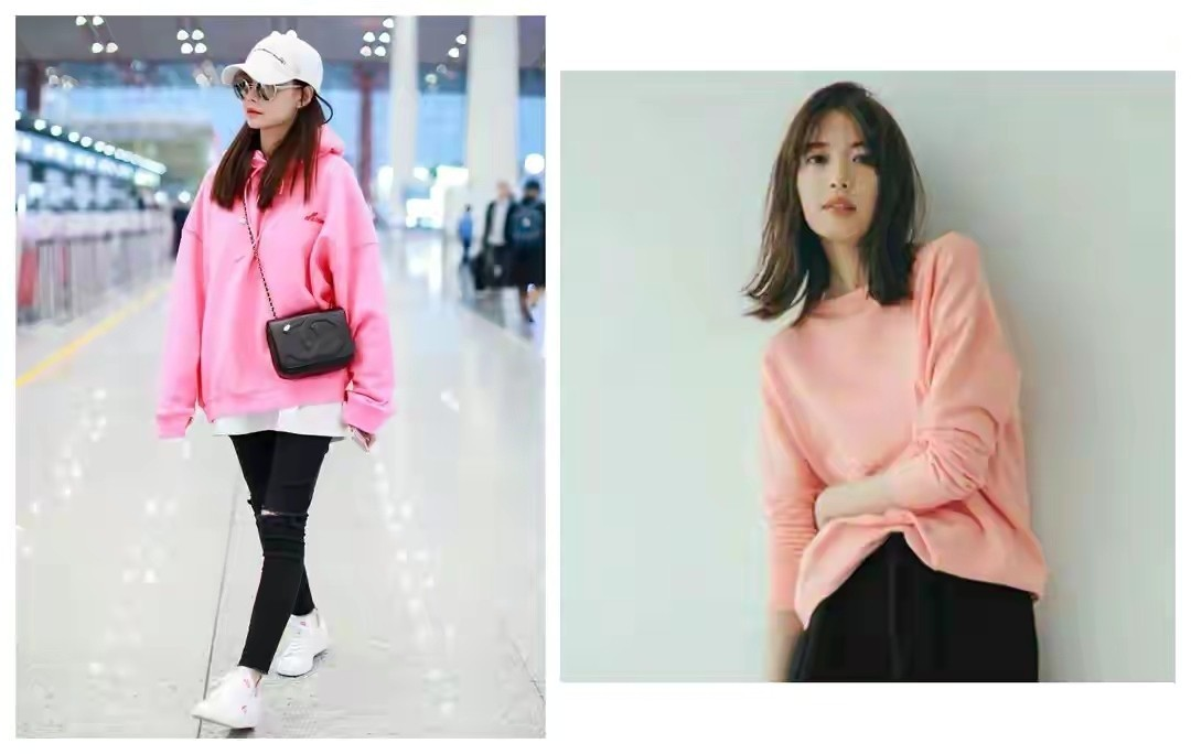 看下图,一个是有点带荧光的、饱和度高的粉色,另一个则是非常耐看的低饱和度的粉橘色,对比之下,气质高下立现。