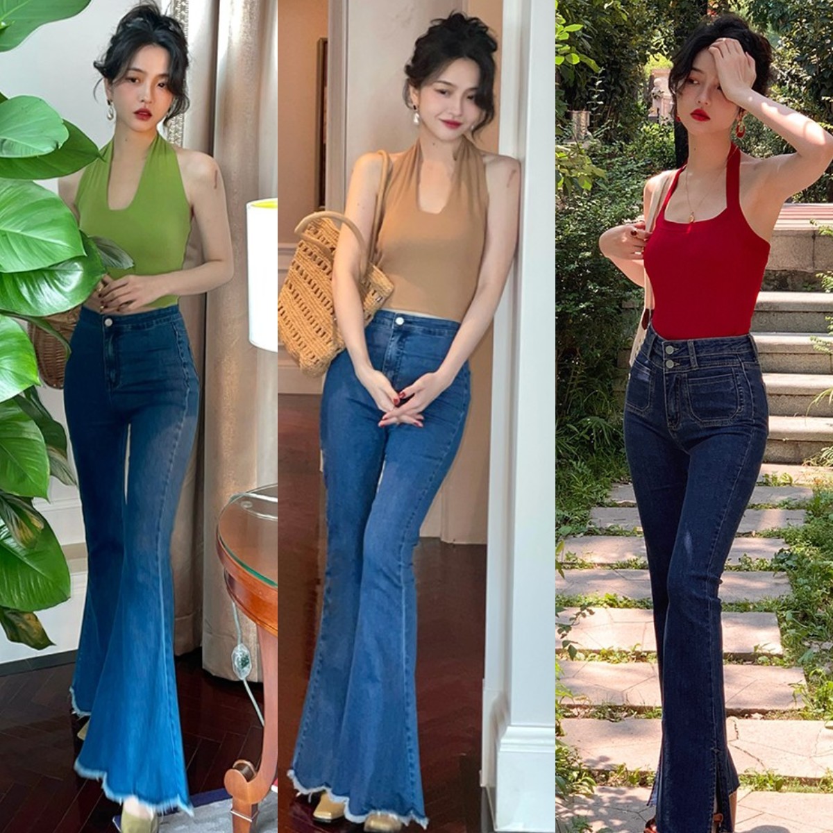 推荐姐妹们在进行此类搭配时,选择下图中的复古蓝喇叭裤来搭配花朵衬衫,色调很正、低调又极具神秘气质的复古蓝色高级感十足,搭配花朵衬衫更添时髦韵味,轻松演绎法式风格的复古浪漫。