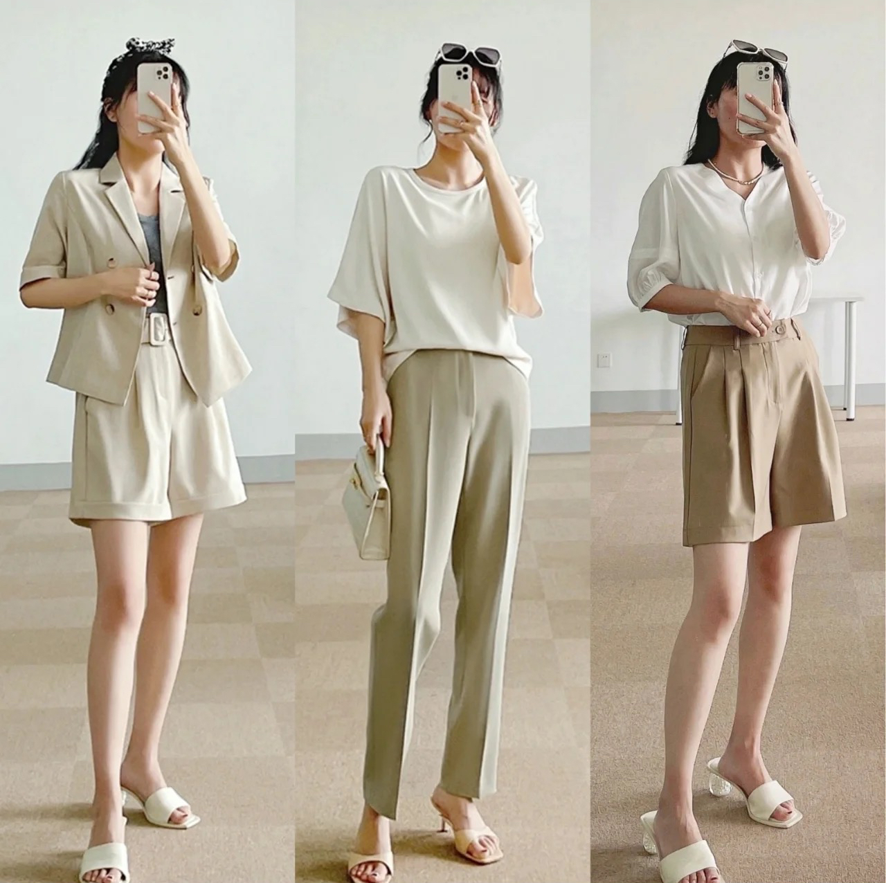 比较常见的有纯棉和西装面料的短裤,配合利落设计,无论是搭配短袖还是衬衫都很干练。如果是上班时间,记得腰间加一条腰带,能够瞬间提升气场和气质!