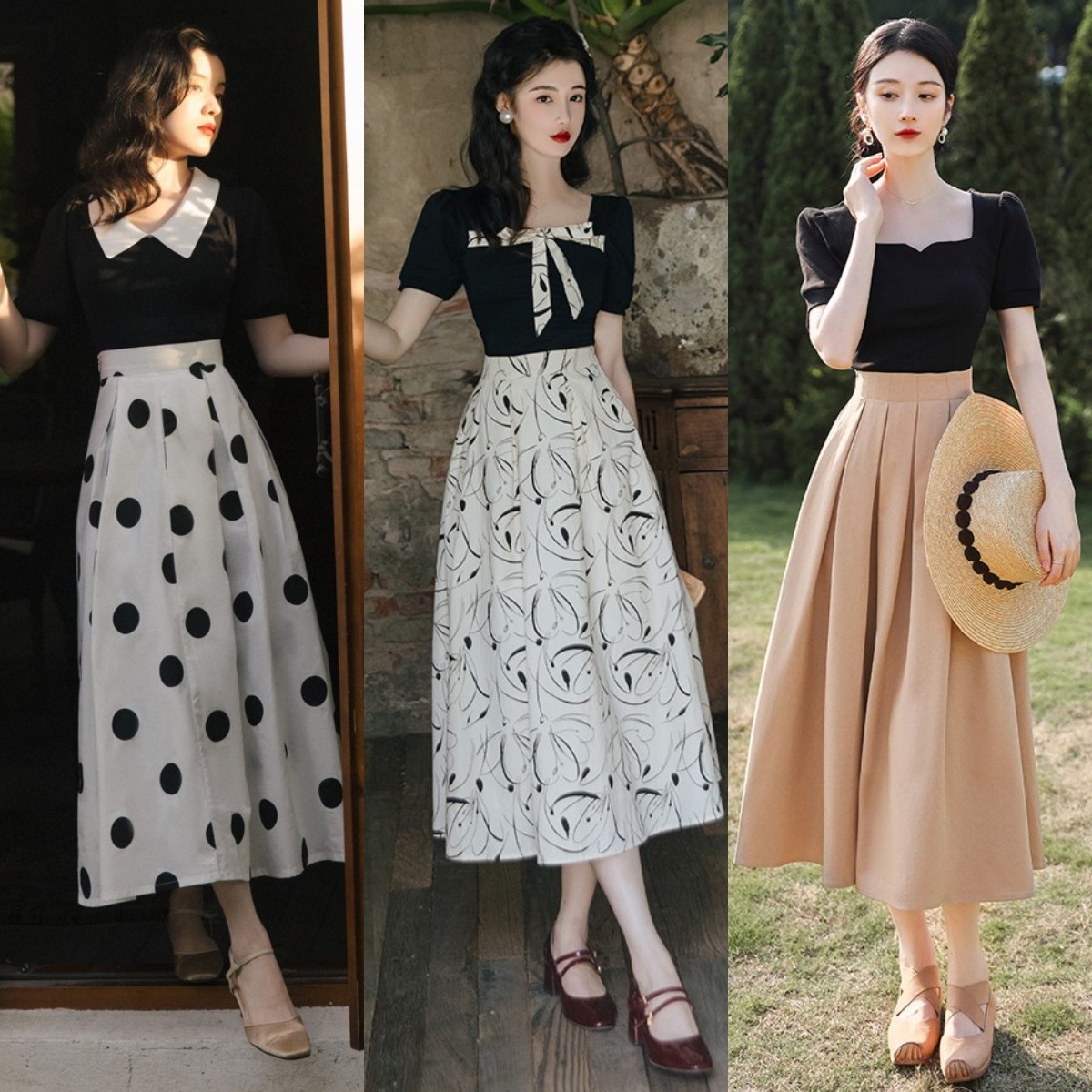 如果想让你的造型看起来更加日常一些,还可以尝试一下加入了“高腰设计”的半身赫本裙。与上衣进行搭配,不仅可以演绎出百变风格,还能利用高腰以及宽松的裙摆修饰下半身的短板,梨形身材的女性可千万别错过。