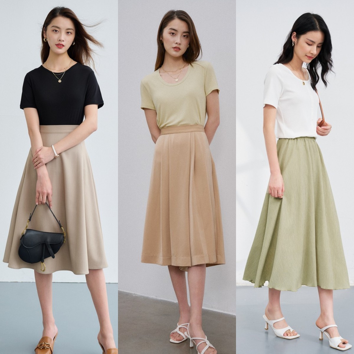 大家在挑选A字半身裙来搭配T恤时,一定要选择高腰的款式。可以在视觉上最大程度的优化身材比例,而且高腰的设计搭配A字版型的裙身更具复古风情,穿出满满的女人味。