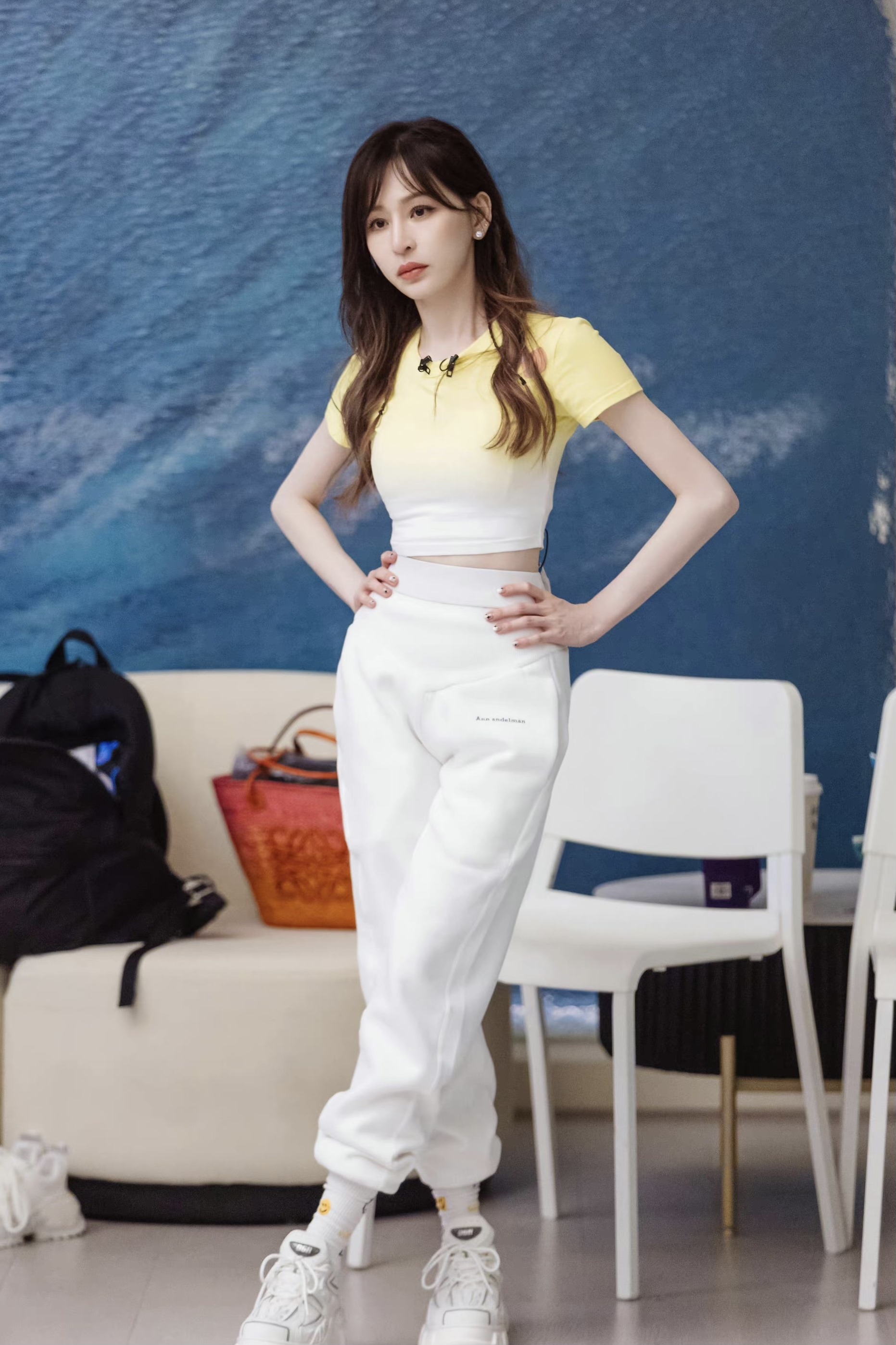 渐变色的黄色紧身短袖,穿上去真的灵动俏皮许多。加上了白色高腰运动收脚裤,王心凌小姐姐还是蛮有心机的,知道自己身材的优点在哪里,虽然她个子不高,但是她的手脚还蛮修长,刚好这么穿更能烘托手脚的纤细。