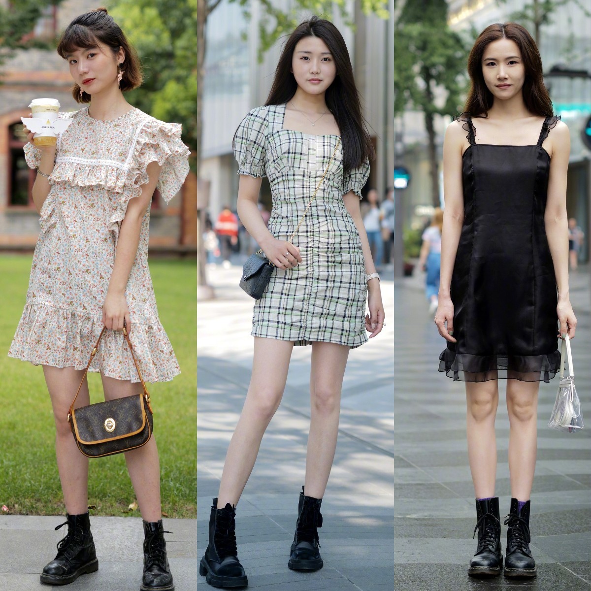 在夏天可以选择上一款及大腿中部的连衣裙,搭配上黑色马丁靴,帅气又有个性。马丁靴的孔数尽量选择六孔或者八孔,更适合一般人的腿部比例。
