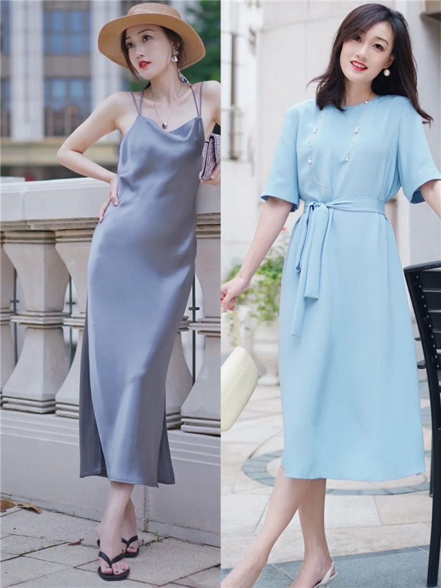 夏日的搭配,像这些优雅的蓝色裙装也是可以大胆入手的,因为蓝色的连衣裙比黑色要清爽,比红色要柔和,没有太强的攻击性,所以黄皮穿也没有问题,肤色暗沉的女性可以多考虑一下这种裙装穿在身上,可以进一步展现出优雅的魅力。并且连衣裙的整体颜色都是统一的,这样便能避免搭配太多颜色,导致违和感。
