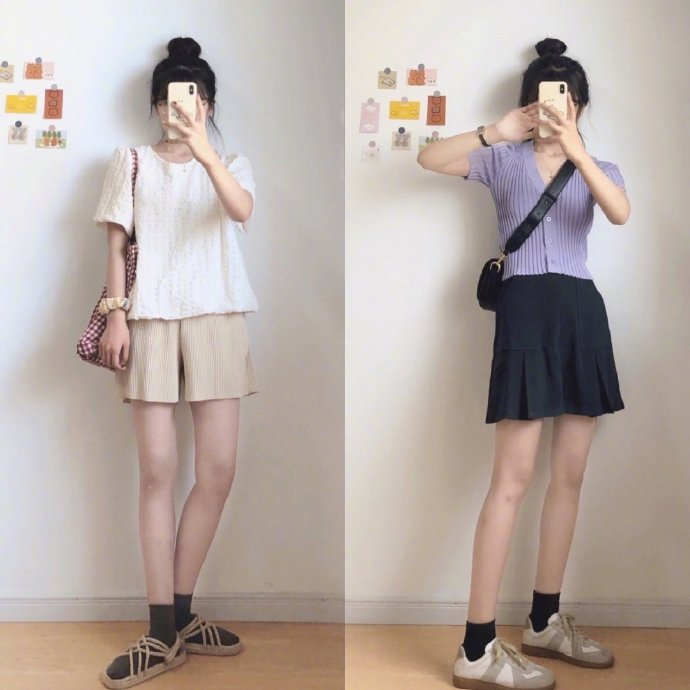 其实,我们如果掌握了一些显高挑的穿衣技巧,那么穿什么衣服就会变得没有那么重要了,如上图中绿色的印花T恤+浅蓝色的牛仔短裤,结合塞衣角的穿法,轻松凸显出高腰线。还有,黄色的上衣+格纹元素裤子,也是塞衣角的穿法,一样可以穿出高挑好身材。